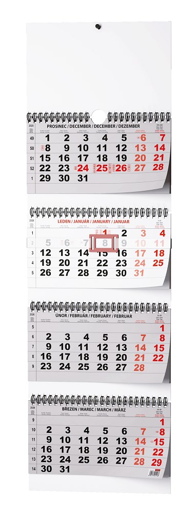 Praktický skládací nástěnný kalendář se čtyřměsíčním kalendáriem a posuvným jezdcem vhodný do Vaší kanceláře. Papír: ofset, 100 g/m2. Karton je z kvalitní bílé lepenky. Součástí je posuvný jezdec z laminovaného papíru, dvojitá kovová spirála "twin wire" s háčkem pro zavěšení. Složený kalendář má rozměry 292×180 mm. Formát 292 x 900 mm.