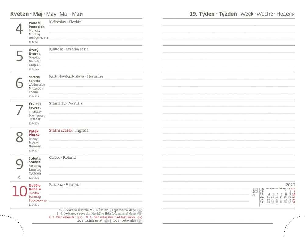 Rozsah diáře: 128 stran. Kalendárium: týdenní kapesní. Formát: 9 x 14 cm.