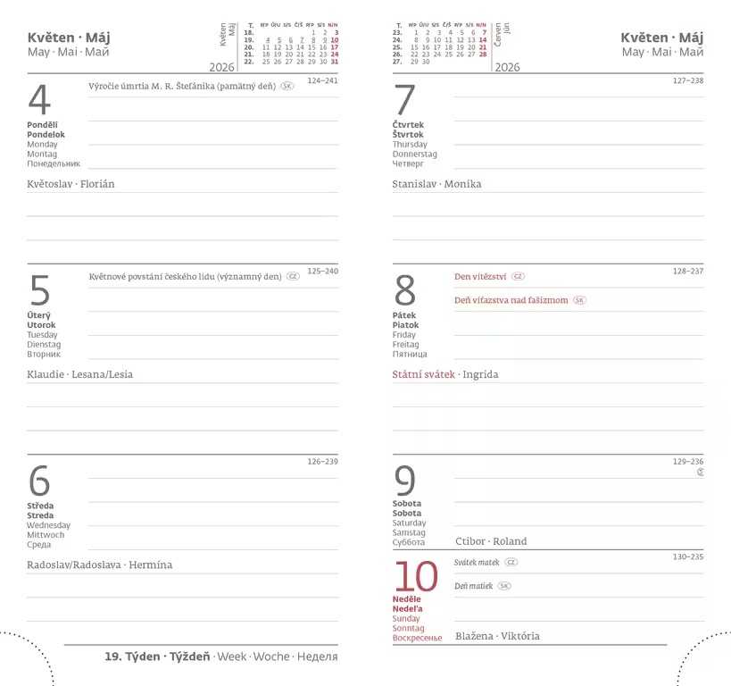 Rozsah diáře: 128 stran. Kalendárium: týdenní kapesní. Formát: 8 x 15 cm.